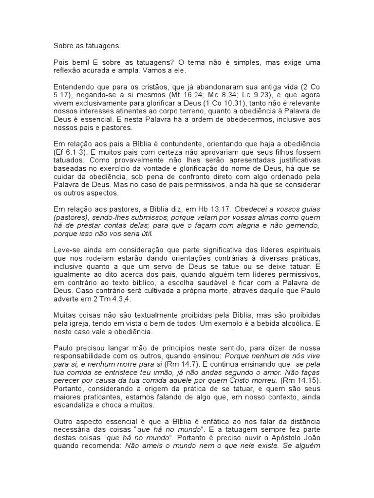 Deuteronômio 142 Embora a Lei dada a Israel não se aplique aos cristãos. Em todas as épocas e lugares do mundo o homem usa o corpo como linguagem. Apostila teologica sobre tatuagem Verificou-se que algumas múmias egípcias exibiam marcas azuis de tatuagens no século 14 ant es de Cristo. If you continue browsing. A pele da pessoa pode ficar marcada com uma cicatriz. O que a Bíblia fala sobre tatuagens objetivamente. Tecnologia de poliureia - COMPÓSITOS by Marmai 1360 views. Deus deu essa proibição à nação de Israel e isso os separava dos povos vizinhos que marcavam a pele com os nomes ou símbolos de seus deuses. 0 Full PDFs related to this paper. A Bíblia só fala uma vez sobre tatuagens em Levítico 1928 que diz. é cobrado apenas uma pequena taxa única que não compromete seu orçamento.